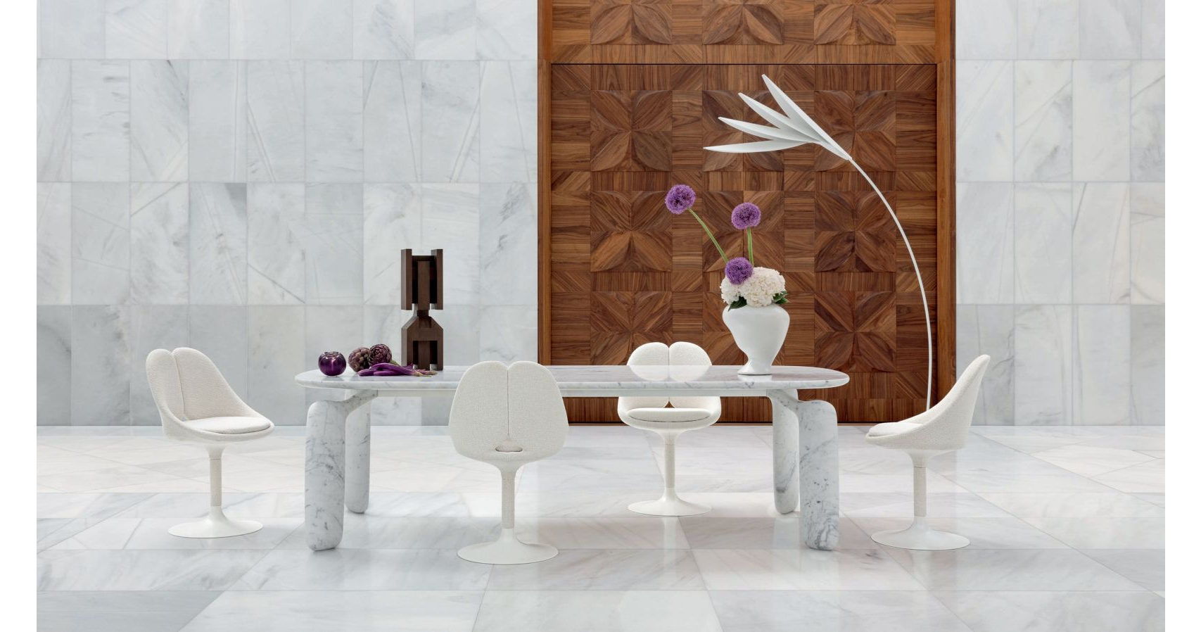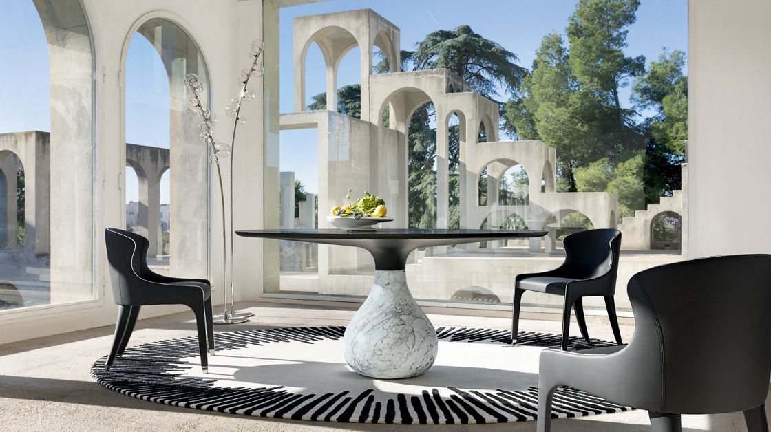 유려한 곡선의 가구와 구조적인 배경이 만나 마치 미술관 속 공간처럼 연출됩니다.