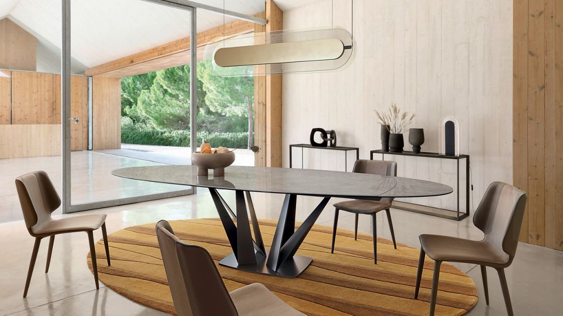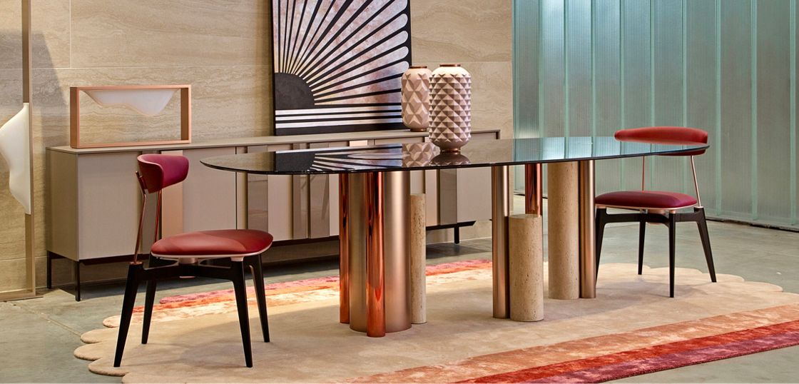 견고한 스톤 테이블과 구조적인 메탈 베이스가 중심을 이루는 이 공간은